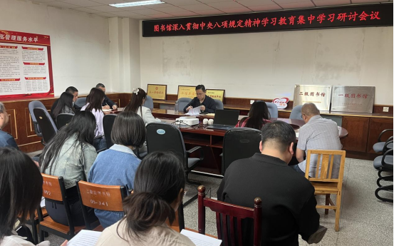 4月16日上午,图书馆党总支召开深入贯彻中央八项规定精神学习教育集中学习研讨会议,会议由党总支书记张拴刚主持,全体党员参加会议。